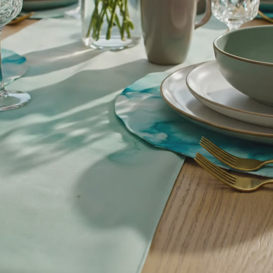 Transform your dining setup into a serene, stylish escape. The Aqua Mist Watercolor Table Runner blends refreshing aqua tones with a soft, hand-painted effect — making every meal feel like a moment of relaxation. Designed for both everyday dining and elegant hosting, its premium poly-woven fabric ensures durability with a luxurious, smooth finish.